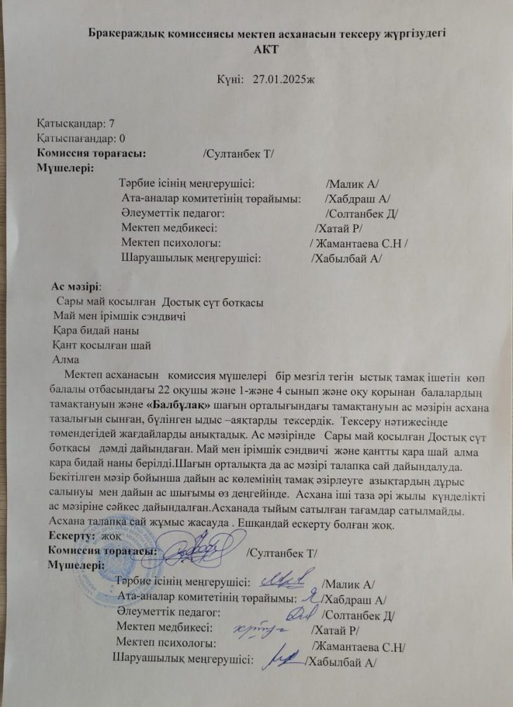 Бракераждық комиссы мектеп асханасының тексеру жүргізу АКТ