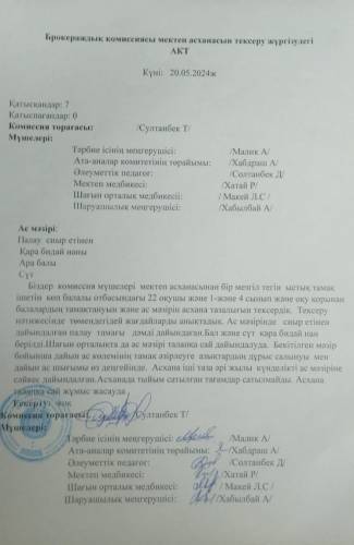 Брокераждық комиссиясы мектеп асханасын тексеру жүргізудегі АКТ.
