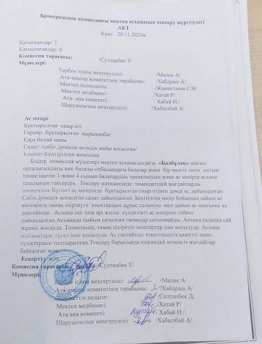 бракераждық комиссиясы мектеп асханасын тексеру жүргізудегі Акт