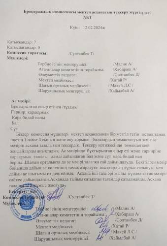Брокераждык комиссиясы мектен асханасын тексеру жургізудегі акт