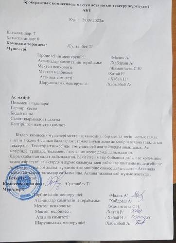 Брокераждық коммиссия мектеп асханасын тексеру. Акт