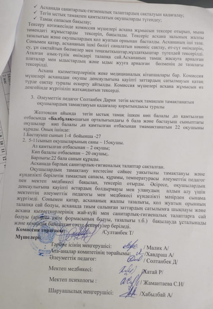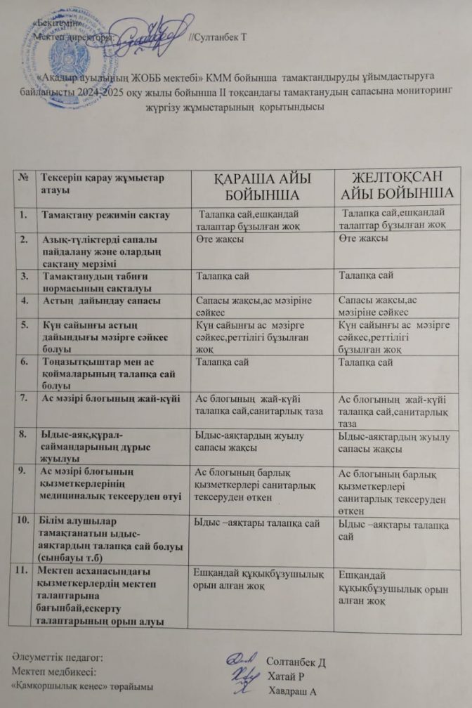 lI тоқсандық тамақтану сапасына мониторинг жургізу жумыстарын корытындысы
