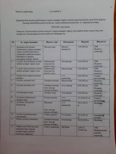1-сәуір мен 27-сәуір аралығында мектебімізде "Дүниежүзілік аутизм мәселесі туралы ақпарат тарату күнінің" аясында жалпы орта білім беретін Ақадыр мектебінде психологиялық-педагогикалық қызметінің іс-шараларына жоспар құрылып, сол жоспар бойынша жұмыстар жүргізілуде. Мақсаты: бүкіләлемдік аутизм мәселесі туралы ақпарат тарату күні жайлы мұғалімдер, ата-аналар, оқушыларға ақпарат беру.