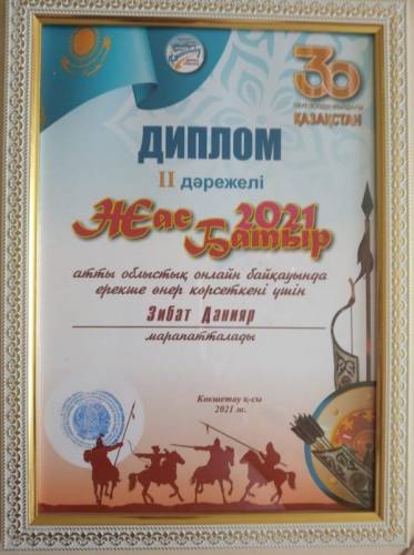"Жас Батыр 2021" атты облыстық онлайн байқауында ерекше өнер көрсеткені үшін Зибат Данияр 2-ші дәрежелі дипломмен марапатталды.