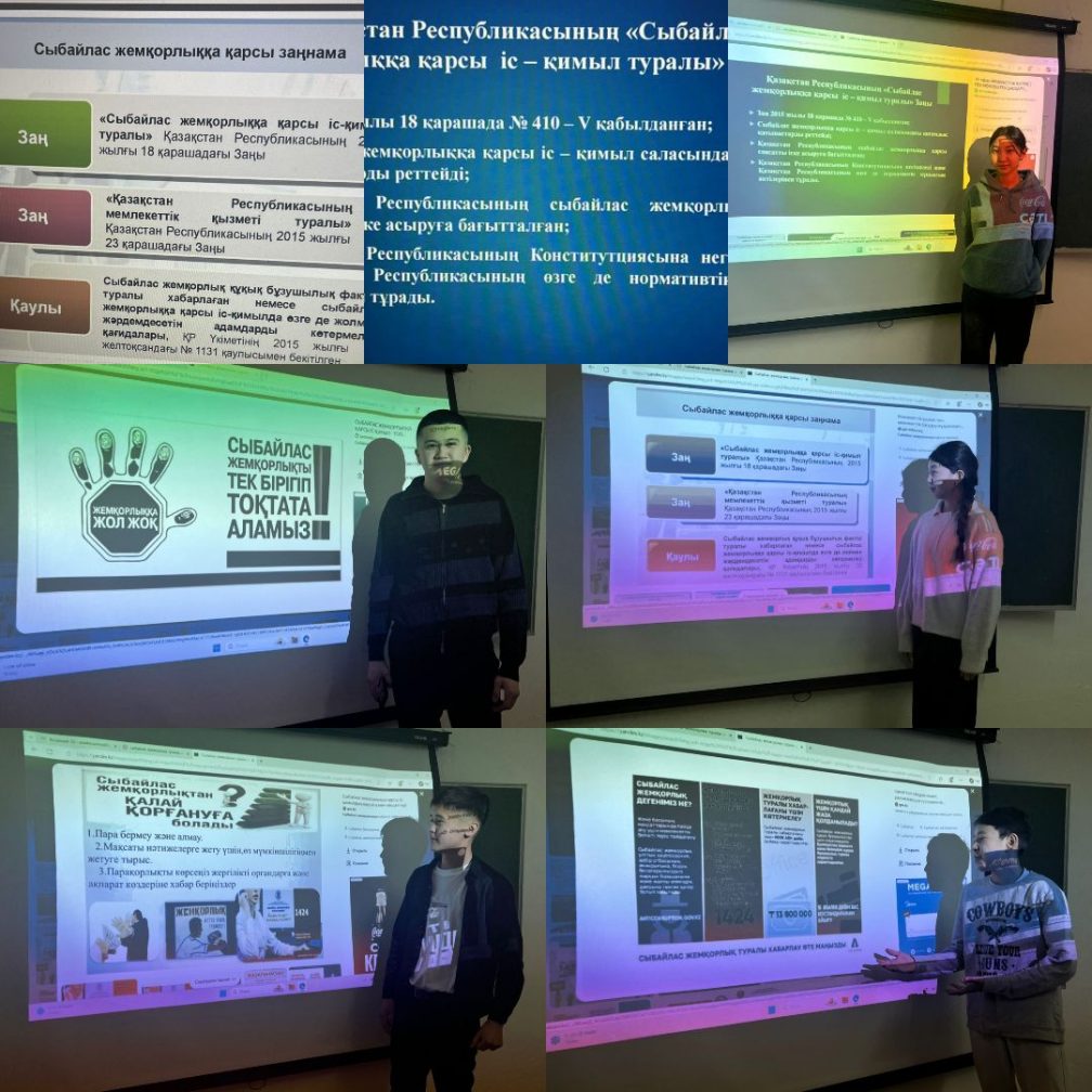 12 қаңтарда 10-сыныпта жоспар бойынша "Біз - сыбайлас жемқорлыққа қарсымыз!" тақырыбында тәрбие сағаты өтті. Мақсаты: Оқушыларға сыбайлас жемқорлық ұғымын түсіндіру; адалдық, әділдік, жауапкершілік құндылықтарын қалыптастыру; жемқорлыққа қарсы азаматтық көзқарас тәрбиелеу және қауіпсіздік бойынша оқушыларға жалған ақпараттың қоғам мен адамға тигізетін зиянын түсіндіру туралы ақпарат беру болатын.Сабақ барысында түрлі ақпарат беріліп, сұрақтар қойылып, тақырыптық слайдттар, бейнероликтер көрсетілді. Өткізген сынып жетекшісі: Кучумова Аида Мейрамовна