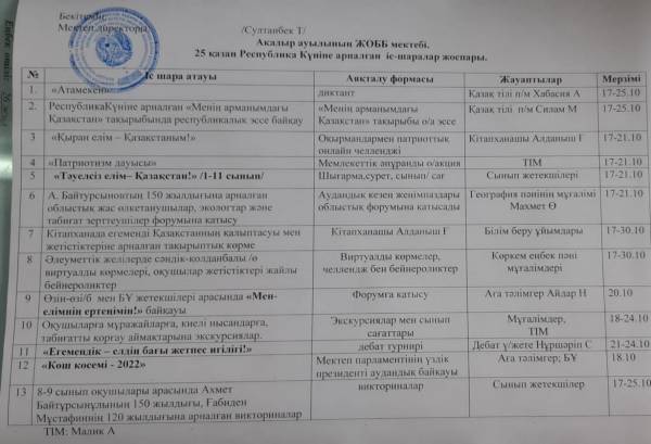25 қазан Республика Күніне арналған қазан айында жүргізілетін іс-шаралар жоспары.