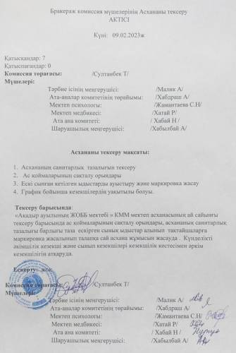 ,,Ақадыр ауылының ЖОББ мектебі,,КММ Тамақтану бойынша брокераждық комиссия мүшелері асхананы тексердік . Әлеуметтік педагог :Солтанбек Дария